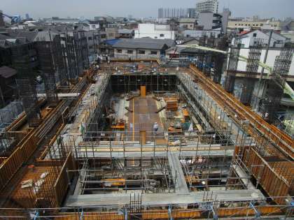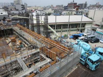 講堂の建て替え工事も進んでいます。いよいよコンクリートを流し込んでいる様子を見ることができました。