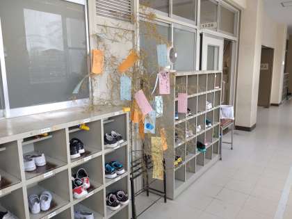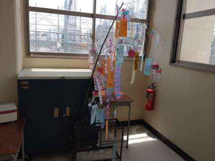 1年生は、それぞれ教室の前に、子どもたちそれぞれが願い事を書いた短冊を吊り下げた笹飾りを飾っていました。