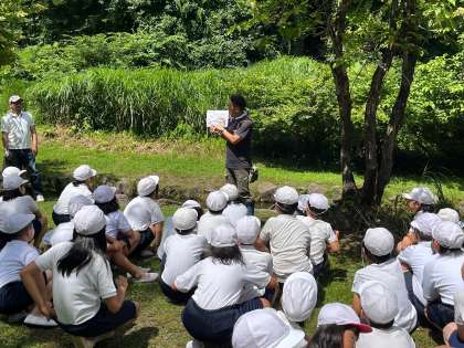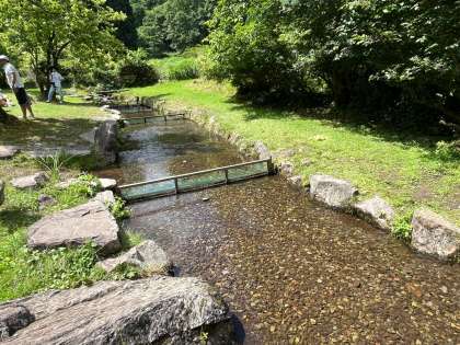 宿舎から少し歩くと円山川の源流が流れています。そこで魚つかみを行います。水温は約7度です。捕まえる魚はアマゴです。