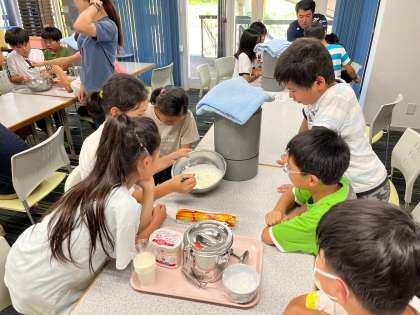 ホイップをツノが立つまでまぜ、ヨーグルト、砂糖を入れてよく混ぜます。なめらかになったら容器に移します。