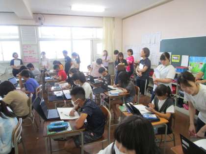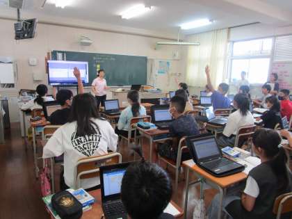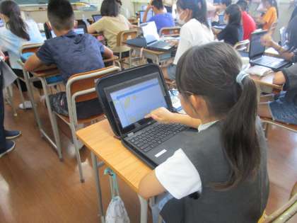 6年生の様子です。算数科で公開授業がありました。工夫して図形の面積を求めるためにタブレットの発表ノートを活用し、面積の求め方を交流しました。図形と面積の求め方の公式を活用し、答えを導いていました。