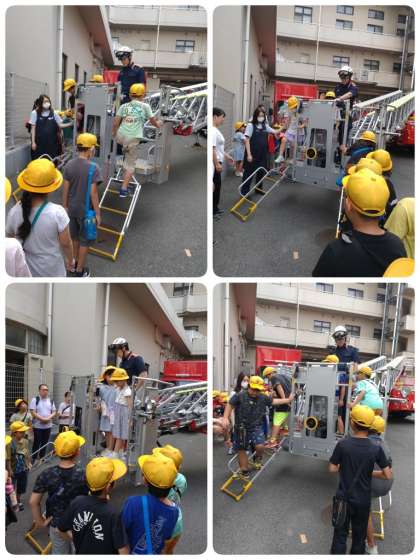 30分ほど、分かれて消防車の説明を聞いた後、全員が集まってはしご車を見せていただきました。