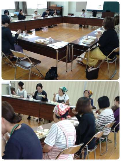 最初に磯路小学校の栄養教諭から、大阪市の学校給食についての講話がありました。給食の歴史や現状、献立について、パワーポイントで作られた資料を使いながら、詳しく説明していただきました。