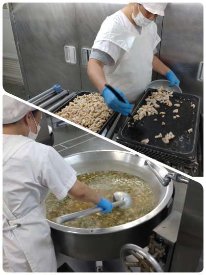 ジューシーは沖縄の伝統料理で、豚ひき肉やにんじん、ひじきなどの海そうが入ったたきこみごはん風のクファジューシーと、よもぎやイモの葉、いかすみがはいった雑炊風の2種類があります。今日は、豚ひき肉ともずく、切り昆布、むき枝豆を使ったクファジューシーが提供されました。