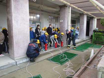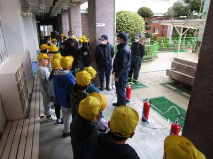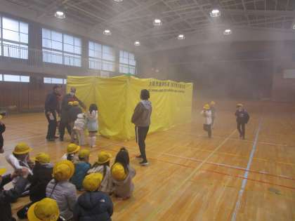 港消防署の皆様には水消火器体験、煙ハウス体験を実施していただきました。子どもたちは消防士さんから直接おしえていただくことができましたので一生懸命、話を聞くことができました。