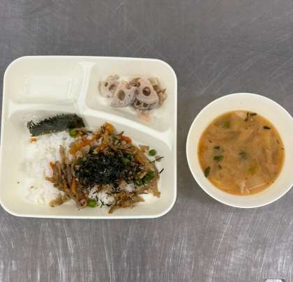 ・鶏ごぼうご飯 ・みそ汁 焼きれんこん ・牛乳