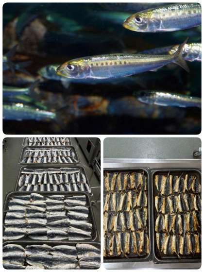 今日は、開いたイワシをホテルパン並べ、焼き物機で焼いたあと、生姜汁・砂糖・みりん・濃口醤油を合わせて煮たものを配缶時にかけて仕上げられていました。