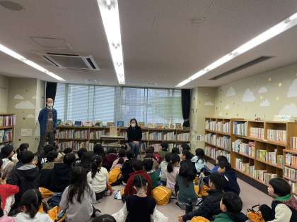 開館前に中に入れていただき、最初に館長さんやボランティアさんから図書館の説明を聞きました。特に館長さんは、子ども達に分かりやすいように紙芝居仕立てで話をしてくださり、とても理解が深まったようです。