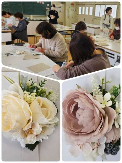 今日の午前10時より、家庭科室にてPTA成人教育委員会主催のコサージュ講習会が行われました。