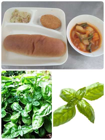 今日の副食の調味料として使用されたバジル(イタリア語でバジルコ)は、シソ科の食用ハーブです。βカロテン・ビタミンE・カルシウム・鉄分が多く含まれ、胃腸を整えたり、食欲を増進させたりする作用があります。今日の給食では、オリーブオイルで炒められたツナとキャベツの味付けとして、塩・コショウ・薄口しょう油と一緒に使用されました。