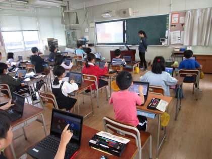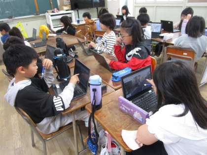 3年生、4年生はタブレットを活用して学習に取り組んでいました。3年生は社会科の学習で地図サイトのストリートビューを使って校区の様子を調べていました。4年生は割り算の計算をゲーム形式で行い、子どもたちは楽しみながら計算の練習に取り組むことにできていました。