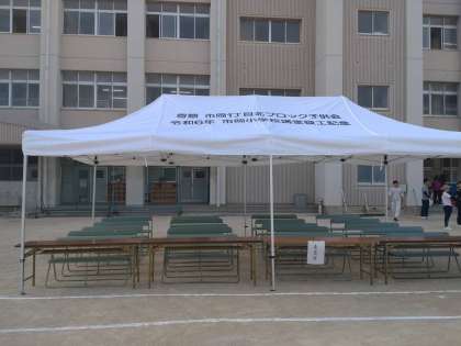 また、新講堂の完成を記念して市岡1丁目北ブロック子供会からテントを2張寄贈していただきました。大切に使わせていただきます。ありがとうございました。
