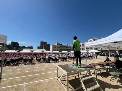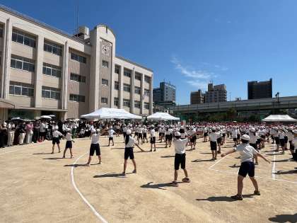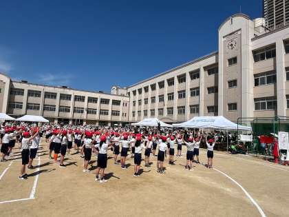 今日は市岡中学校のグラウンドをお借りしまして、本校の運動会を開催しました。晴れ渡った青空の下で運動会が始まりました。早朝よりPTA、地域の皆様にご協力をいただき児童席のテントを張っていただきました。おかげさまで子どもたちは日差しを避けて座席に座ることができました。ありがとうございました。