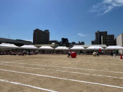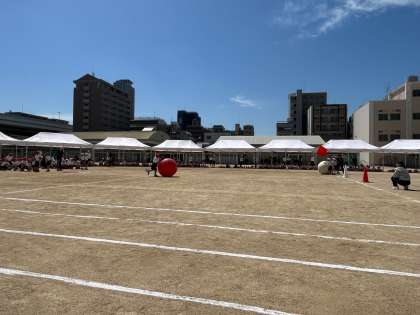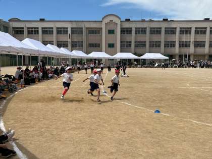 2年生は団体競技「ごろん!ごろん1ごろん!」個人走「ゴールをめざしてゴーゴーゴー!」に出場しました。大玉転がしでは、自分の身長と変わらない大きさの大玉を一生懸命転がしていました。まっすぐ転がすのも難しかったと思いますが、二人で力を合わせて頑張っていました。