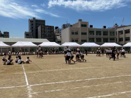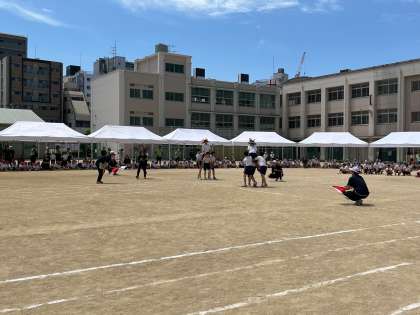 団体戦は決着がつかず、最後は大将どうしの一騎打ちを行いました。観戦している低学年の子どもたちは大きな声を出して6年生を応援していました。とても盛り上がった騎馬戦でした。