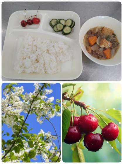 今日の給食では、山形県産のサトウニシキというサクランボが提供されました。