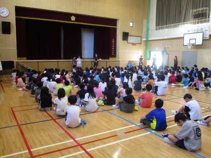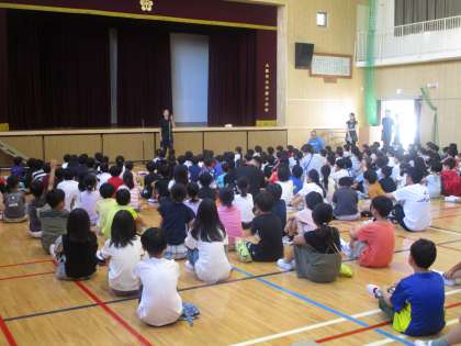 朝は体育館で児童朝会を行いました。7月に入り、朝でも暑さが厳しいので体育館で児童朝会を行います。給食委員会の子どもたちから残食を減らす取り組みの話がありました。しっかり説明することができていました。