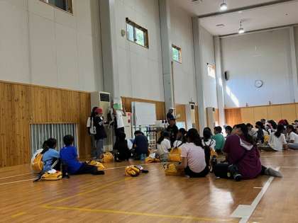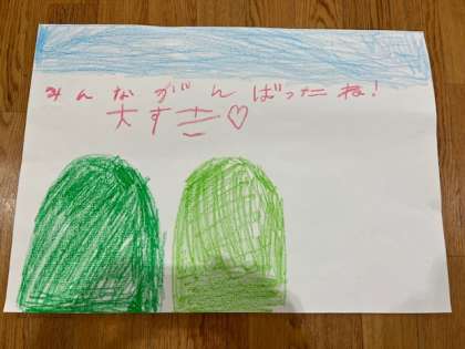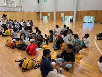 登山のあとは冷房のきいた体育館で休憩し、スポーツドリンクをいただきました。登山を見送り、本部で待機していた子どもはみんなを労う手紙とイラストを体育館で披露してくれました。心が温まる場面でした。