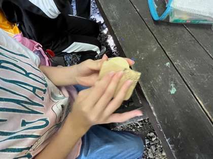 指導員の方からウッドクラフトの作り方を教えていただきます。木片をしっかり紙やすりで磨くと表面に艶が出てツルツルになります。