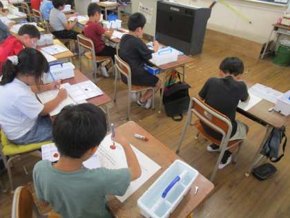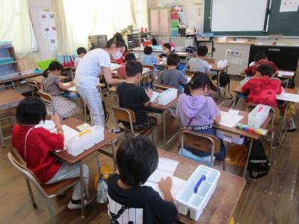 2年生は図画工作科で絵の具の使い方を学習していました。初めて絵の具を使う時間でした。先生からパレットなどの説明があり、ワークシートを使って実際に色を塗っていました。水の量を調節することで色の広がり方が全く違うことに気づいていました。これからが楽しみだと思います。