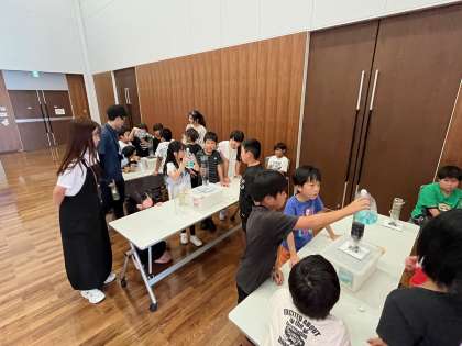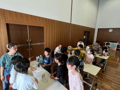 会議室では浄水処理の仕組みを実際に模型を使って実験し、確かめることができました。砂や活性炭を使って水がきれいになる様子に子どもたちは驚いていました。