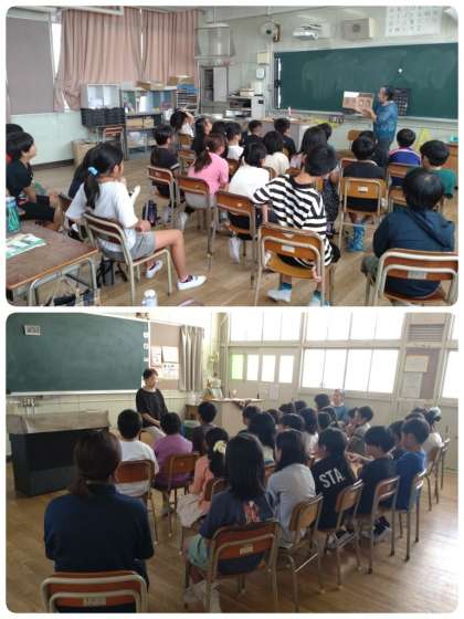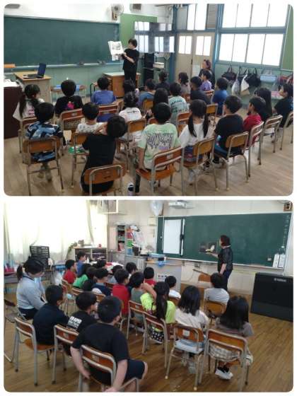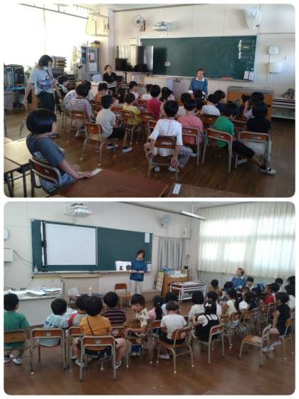 今日は、港図書館の読書ボランティアの1つである「かたりの会さざなみ」の方に来ていただき、1〜3年生の各クラスで1時間ずつおはなし会をしていただきました。