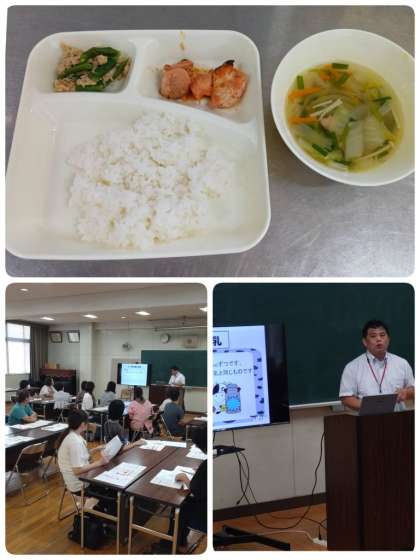 最初に子どもたちに栄養指導をしていただいている磯路小学校の栄養教諭から、大阪市の学校給食についてお話していただきました。「大阪市では、小中学校の児童生徒・教職員分として18万人分の給食を実施している。」や「食物アレルギー対応のためや、気候によって収穫されなかったため、提供されなくなったメニューがある。」など、学校給食を取り巻く状況について分かりやすく説明がありました。。