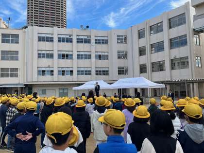 今日は市岡小学校の屋上プール付き講堂兼体育館の竣工式を行いました。早朝より、子どもたちが行うバルーンリリースに向けて、地域、PTAの皆様が準備に来ていただきました。本当にありがとうございました。