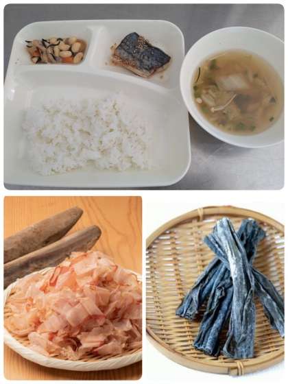 今日の給食のすまし汁と大豆の煮物には、削り節(サバ節と煮干しを混ぜたもの)と昆布でとった出汁を使っていました。