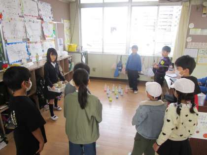 4年生のお店は「宝さがし」「ゴーゴーゴーボーリングッド」でした。宝物を探すときの約束や、ボーリングのピンを倒すときの玉を投げる時のルールや約束をきちんと説明できていたので、スムーズに進行できていました。