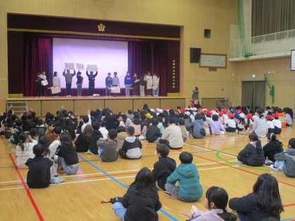木曜日の朝は児童集会があります。今日は委員会発表でした。図書委員会と情報委員会が発表しました。それぞれの委員会の取り組みをクイズやスライドを使ってわかりやすく説明することができていました。