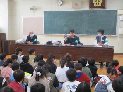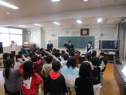 3時間目は、3年生の社会科の学習で港警察署の方々にゲストティーチャーとしてお越しいただき授業を行いました。普段、姿は見ていても、直接話せる機会はなかなかありません。今日は警察官の仕事や勤務場所、持ち物などについて詳しくお話しいただきました。子どもたちも質問の中で「警察官になってうれしかったことは」「何がむずかしく感じますか」など、いい質問がでていました。警察官は「犯罪は許さない」「弱い立場の人をまもる」この2つは全警察官が使命として持っていることと教えていただきました。