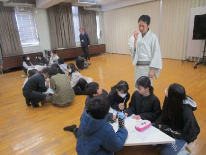 今日は2回目でした。3学期にかけて5回、授業に来ていただく予定です。今日は各グループでネタを考えました。福丸さんにアドバイスをもらうと、子どもたちのアイデアはどんどん膨らんでいきます。落語を演じる子どもも決まっていますので、3学期は落語の発表に向けてますます本格的になってきます。楽しみです。