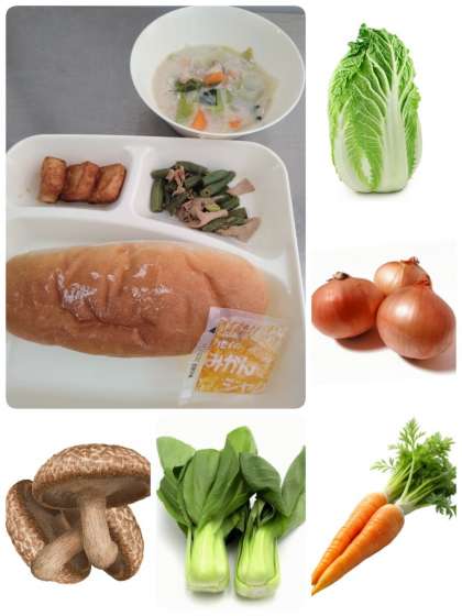 今日のクリーム煮には、白菜以外にニンジン、玉ねぎ、生しいたけ、チンゲン菜の計5種類の野菜が使われていました。