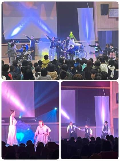 今日の3・4時間目、本校講堂にて全学年児童対象の車いすダンス公演鑑賞会を行いました。