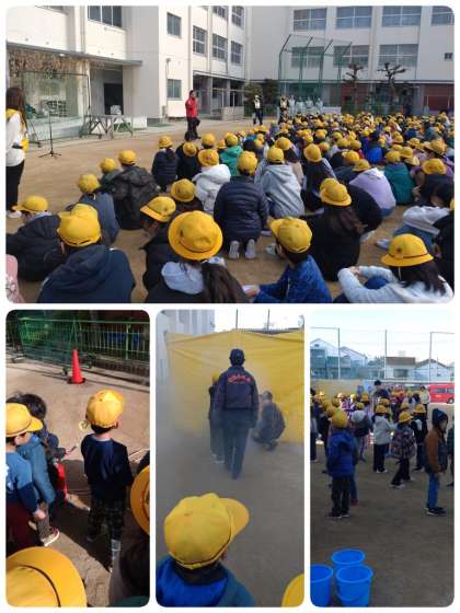 そして2時間目、1〜3年生は運動場で防災体験、4〜6年生は講堂で防災学習を行いました。運動場では、港消防署に来ていただき水消火器と煙テントを、地域防災担当に来ていただきバケツリレーを、学年ごとに順番に体験しました。また活動前後にも、防災についてぞれぞれの方からお話を聞きました。