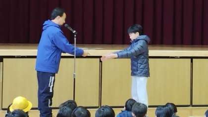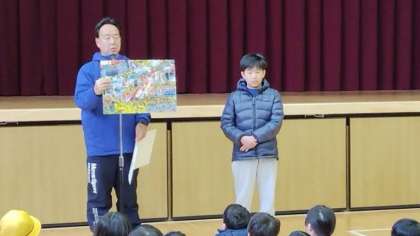 毎週月曜日に児童朝会を行っています。朝会では、地域のドッチボールやキックベース等で優秀な成績を収めた児童たちの表彰を行っています。この日はそれに加え、6年生が描いた「子どもの防火図画」作品で大阪府知事賞に入選されました。細かなところまで描きながらも迫力のある作品に、それを見た子どもたちも驚いている様子でした。