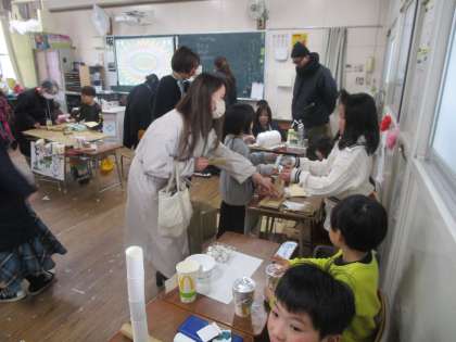 2年生は各教室でおもちゃランドを開きました。保護者の方と子どもたちが作ったゲームで一緒に遊ぶことができ、とてもうれしそうでした。