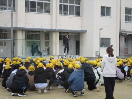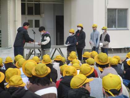 今日は1年生から6年生がそろう最後の児童朝会でした。6年生にはタイピンググランプリの成績優秀者に賞状を渡しました。6年生は最後の朝会もきちんと整列して並び、お手本となっていました。