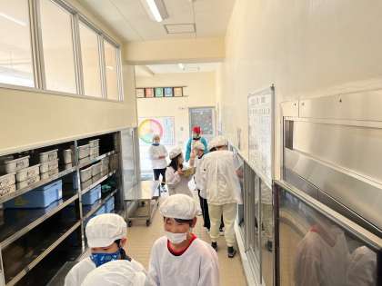 各学級で給食当番が中心になり、準備をします。給食当番は身支度や手洗いを済ませ、見本をよく見て丁寧に配膳しています。