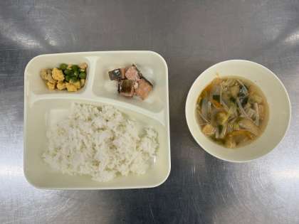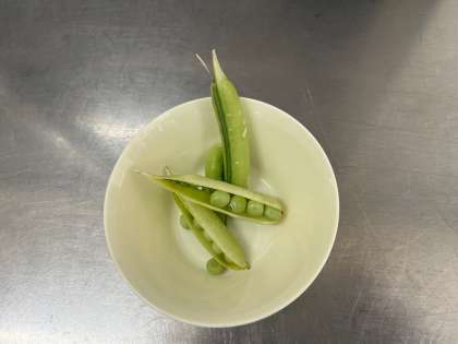 今日のえんどうの卵とじは、写真のように、給食室でさやから豆を取り出したえんどうを使っています。