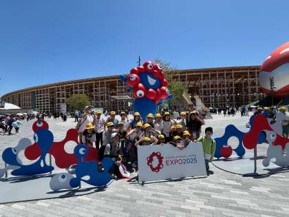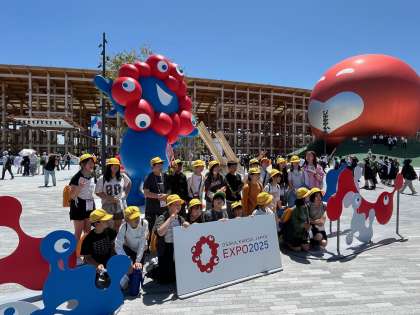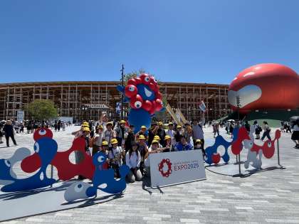 万博のキャラクターの前で記念撮影をすることができました。いい記念になりました。