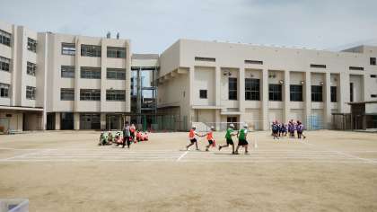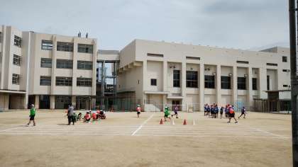 5時間目は5年生が運動場でリレーの練習をしています。バトンパスの仕方を各グループごとに確かめていました。