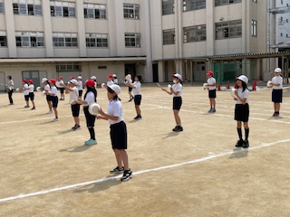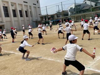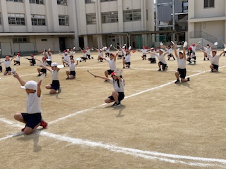 4年生では、体育の時間に運動会で披露するエイサーの練習をしています。