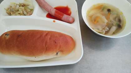今日の給食はウインナーのケチャップソース、スープ、焼きツナキャベツ、レーズンパン、牛乳です。