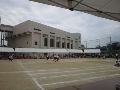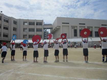 1年生は団体競技「ミャクミャクを作れ!!」、個人走「風のようにダッシュ☆」に出場しました。小学校での初めての運動会でしたが、立派にできました。「ミャクミャクを作れ!」は万博開催に合わせ、工夫した競技でした。ミャクミャクカラーの飾りを身に着け、ダンスを交えながらとてもかわいい姿が印象的でした。