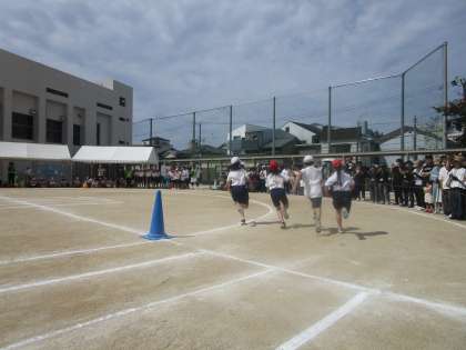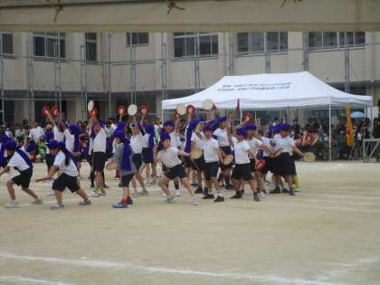 4年生は団体演技「心ひとつに!エイサー魂」、個人走「走り出せ!全力少年少女!」に出場しました。4年生は沖縄の伝統芸能「エイサー」に取り組みました。大正区の小学校から太鼓のパーランクーと頭に巻くサージをお借りし、本番の演技を行いました。パーランクーの音が響き渡り、子どもたちの心が一つになった瞬間でした。迫力のある演技でした。