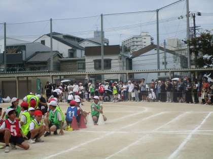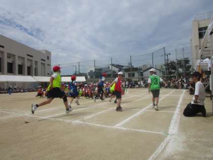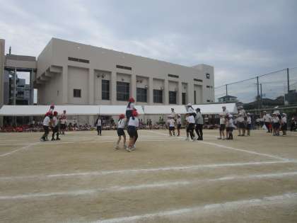 5年生は団体競技「クラウンハント」、個人走「ミッションコンプリート」に出場しました。団体競技の「クラウンハンド」は従来の騎馬戦です。大将の掛け声で行った団体戦は子どもたちの作戦もあり、見ごたえがありました。個人走はリレーと障害物リレーの2回戦でした。様々なミッションをクリアしながら子どもたちはタスキをつないでいました。