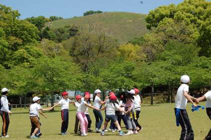 5月8日、5.6年生が、奈良公園に遠足に行きました。大仏殿を見学後、公園の芝生の上で、5.6年生全員が男女混合のチームに分かれ、「しっぽとり」ゲームを楽しみました。