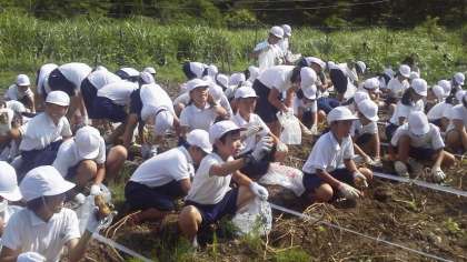 まずは、近くの畑でジャガイモ掘りをしました。一つ見つけるとあとはそれこそイモづるしきにわんさか出てきます。「めっちゃ大きいやろ!」とイモを持っていい笑顔。おみやげに持ち帰ります。お楽しみに。